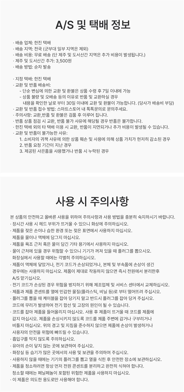· 교환/반품/AS 등은 "공정거래위원회"에서 정한 소비자 분쟁 해결 기준을 따르고 있습니다.