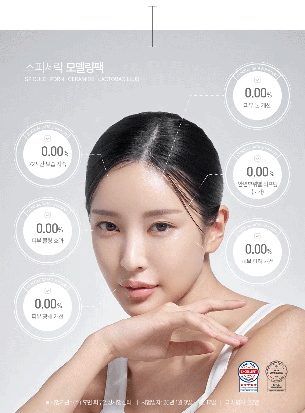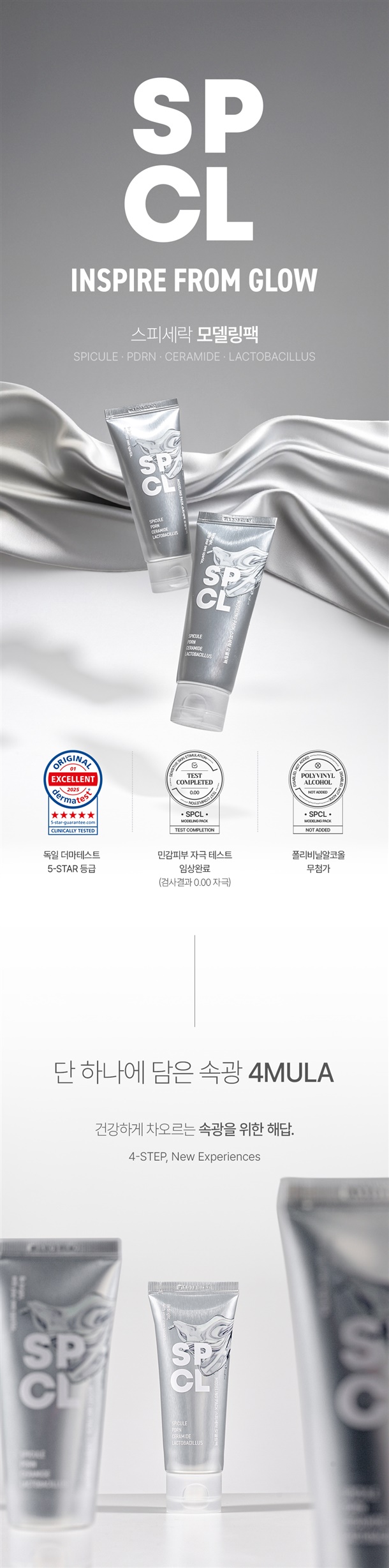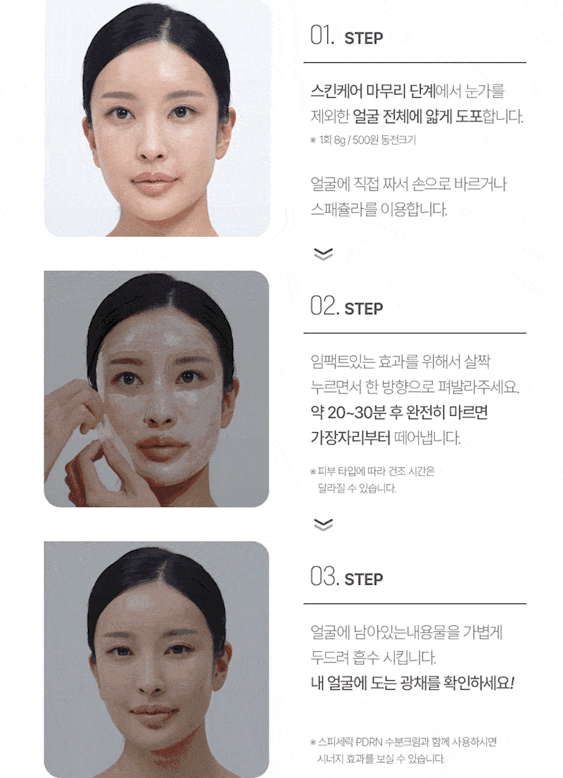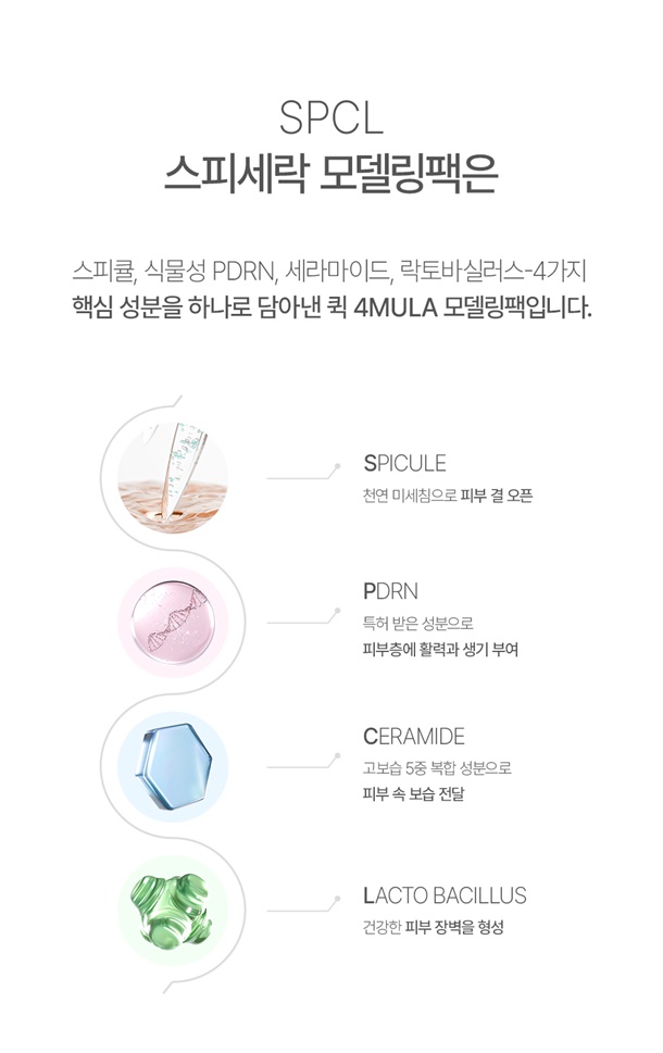 기존 모델링팩의 번거로운 과정없이 간편하게 사용 가능한 신개념 모델링팩! 독일 더마테스트 5-STAR 등급 / 스피큘, 식물성 PDRN, 세라마이드, 락토바실러스-4가지 핵심 성분을 하나로 담아낸 퀵 포뮬러 모델링 팩! 지금 바로 만나보세요:)